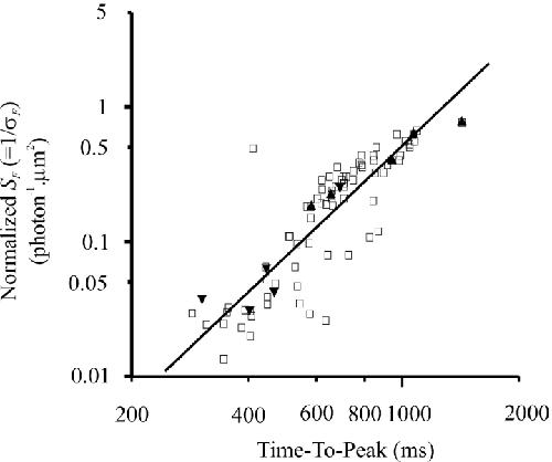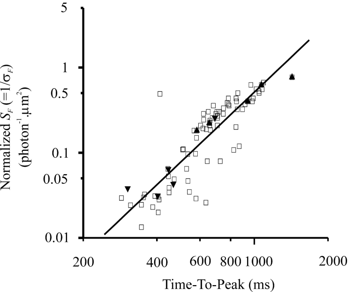 Figure 8. . Same power-law relation between normalized flash sensitivity and response time-to-peak during development as with light bleaches. Log-log coordinates. □, control, dark-adapted rods from different developmental stages; ▴, rods at stage 53 or later before bleaching (3 cells at stage 54, 1 at stage 56, and 1 at stage 58); ▾, the same cells after bleaching. The straight line fitted to the control rod data has a slope of 2.84. The cells marked by triangles are the same cells as those marked by filled squares in Fig. 9 (see Fig. 9 legend).