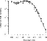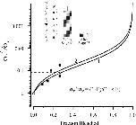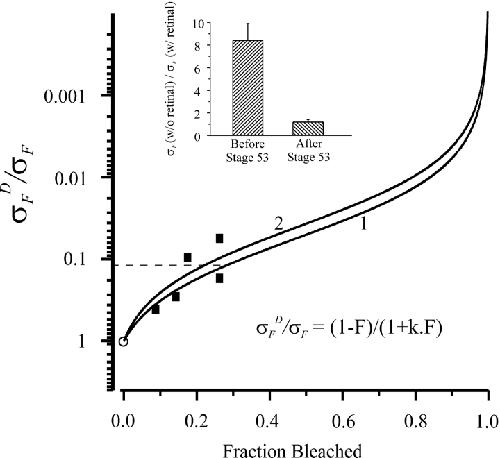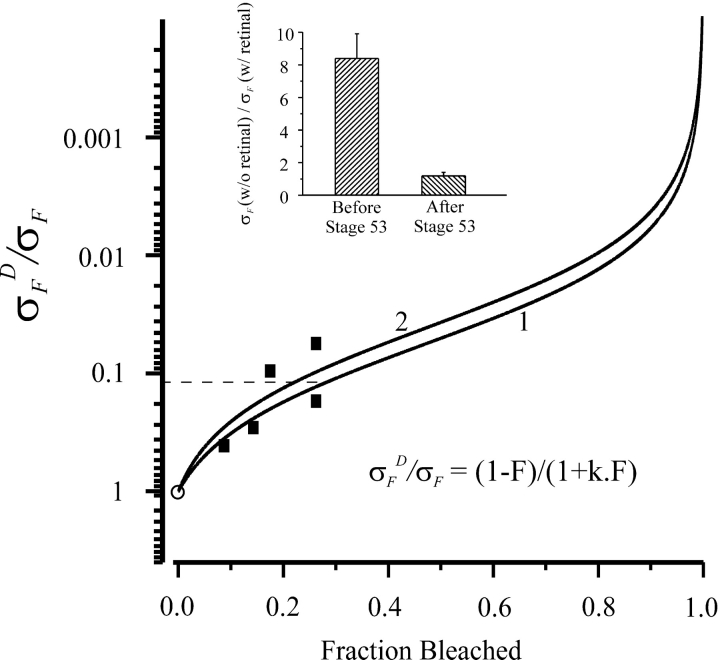 Figure 9. . Calculation of fractional free opsin in prestage 53 rods. The ratio of normalized flash sensitivity pre and postbleach, represented by , is plotted against fraction bleached and used as a standard, obtained from five poststage 53 cells indicated by filled squares. Same cells as those marked by triangles in Fig. 8; the point at zero fractional bleach (open circle) is simply a constraint for the curve fit. The stage, % bleach, and “steady-state” dark current before and after bleach of each cell were: stage 53, 17.5%, 13.9 pA, 7.5 pA; stage 54, 26.2%, 12.2 pA, 4.1 pA; stage 54, 14.3%, 30.3 pA, 17.1 pA; stage 55, 8.7%, 15.3 pA, 10.9 pA; stage 55, 26.2%, 15.3 pA, 10.4 pA. Continuous curves are Eq. 3 with k = 17.8 (Curve 1) and 25 (Curve 2). (Inset) Ratio of flash sensitivity with and without 11-cis-retinal treatment. 10 cells in total before stage 53 (4 at stage 50, 1 at stage 51, and 5 at stage 52) and 5 cells in total after stage 53 (3 at stage 54, 1 at stage 56, and 1 at stage 58). Sensitivity ratio before stage 53 being ∼8.5 and close to unity after stage 53. The reciprocal of 8.5 (horizontal dotted line) is used for estimating percentage of free opsin in prestage 53 rods, which gives 28% from Curve 1 and 22% from Curve 2.