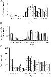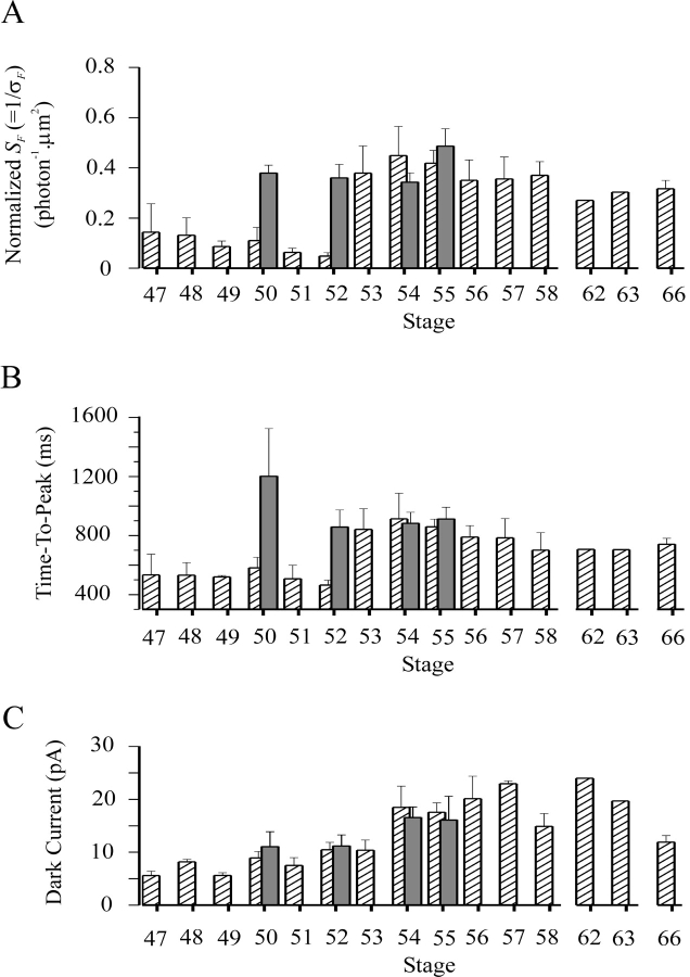 Figure 7. . Normalized flash sensitivity, time-to-peak of half-saturated flash response, and dark current at different developmental stages, after pretreatment of the isolated retina with 100 μM 11-cis-retinal for 40 min in darkness. Experiments on rods of overnight-dark-adapted tadpoles at stages 46–66 and frogs at sizes of 2.5–5 cm, as in Fig. 5. Dark bars indicate the collected chromophore-pretreatment data, showing average ± SEM. The number of rods measured at each stage are 4(stage 50), 6(52), 5(54) and 2(55). The hatch bars are redrawn from Figs. 5, B and C, and 2 A.