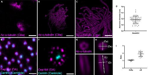 (I) Dx/Dy and L/D ratio quantification. Average is 1.06 for Dx/Dy and 1.89 for L/D. Data are represented as mean ± SD. (n=30 centrioles from two independent experiments).