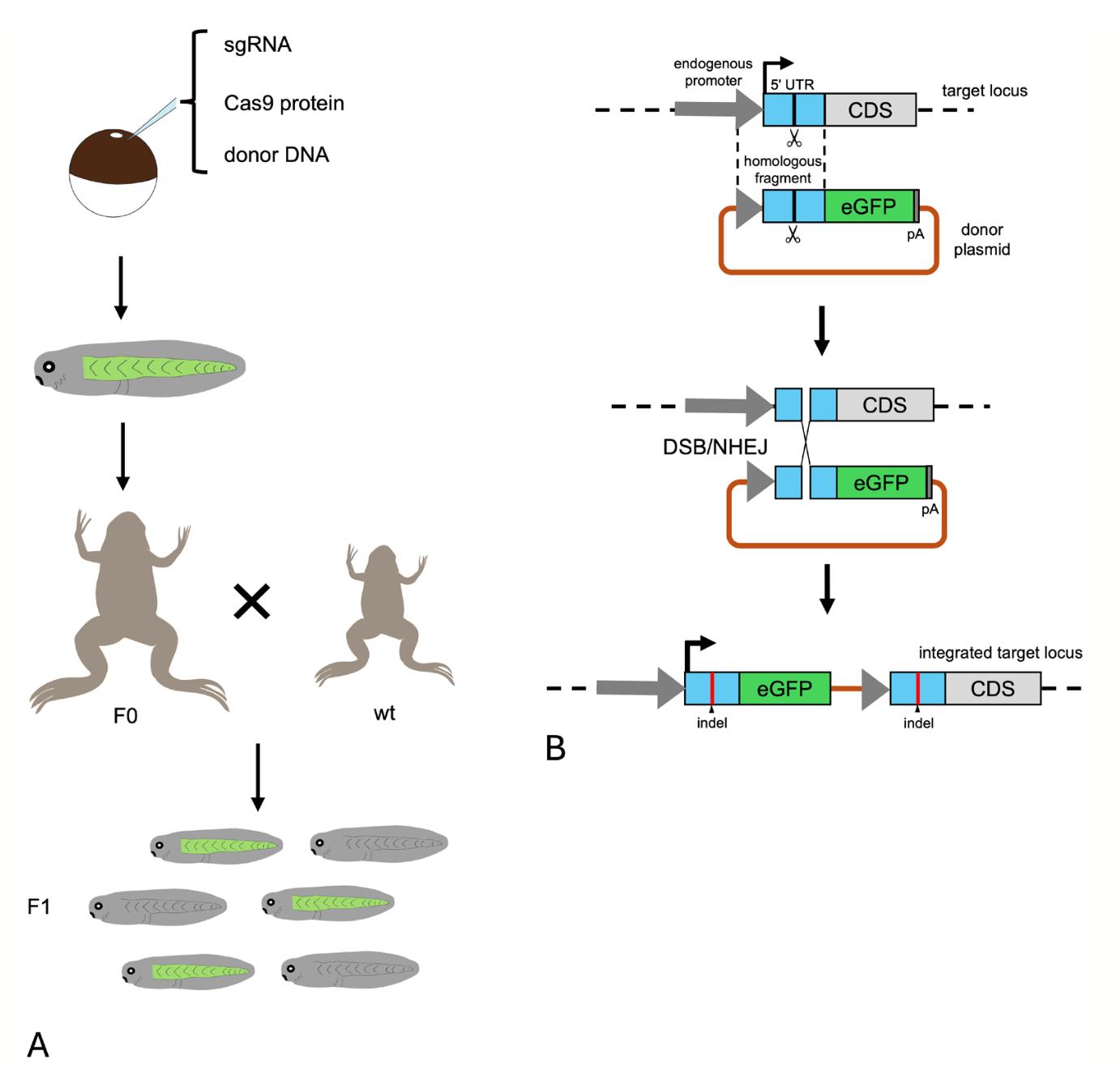 FIGURE 1 | Overview of NEXTi. (A) Summary of the NEXTi procedure to make a knock- in founder and F1 offsprings. The NEXTi donor plasmid carrying the egfp is injected into fertilized Xenopus laevis eggs with Cas9 protein and a single guide RNA. Selected founder (F0) expressing tissue-specific eGFP is outcrossed with wild- type animal (wt) to obtain F1 animals. (B) Schematic representation of targeted integration by NEXTi. The Cas9 RNP binds and cleaves both the target sequences in the donor plasmid and the 5′ UTR of the target locus. The plasmid integrates into the target sites in the zygotic genome via DSB/NHEJ. Insertion and/or deletion (indel) is found in the upstream and downstream junctions.
