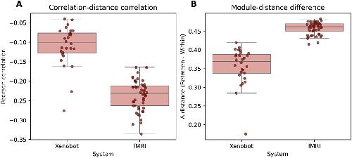 Figure 9. Bivariate transfer entropy. (A) This plot shows the proportion of possible pairs (i.e. Of all possible 𝑋𝑖,𝑋𝑗∈𝑋) that showed significant transfer entropy. Both the fMRI scans and basal Xenobot recordings showed some multi-cellular directed information flows, although basal Xenobots were considerably sparser. (B) For both fMRI scans and basal Xenobot recordings, the empirical, significant transfer entropies were significantly higher than their respective circular shifted nulls.