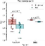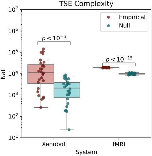 Figure 8. Tononi-Sporns-Edelman complexity. Both fMRI scans and basal Xenobot recordings showed higher TSE complexity [Citation82] than their respective autocorrelation-preserving null models. These results show that the higher-order structure in brains and bots spans the whole system, involving multiple orders of interaction. The TSE complexity is understood as being maximized by a balanced combination of integration and segregation: it is low both when the whole system is synchronized, and also when all elements are independent. It is maximized when higher-order integration co-exists with lower-order independence.