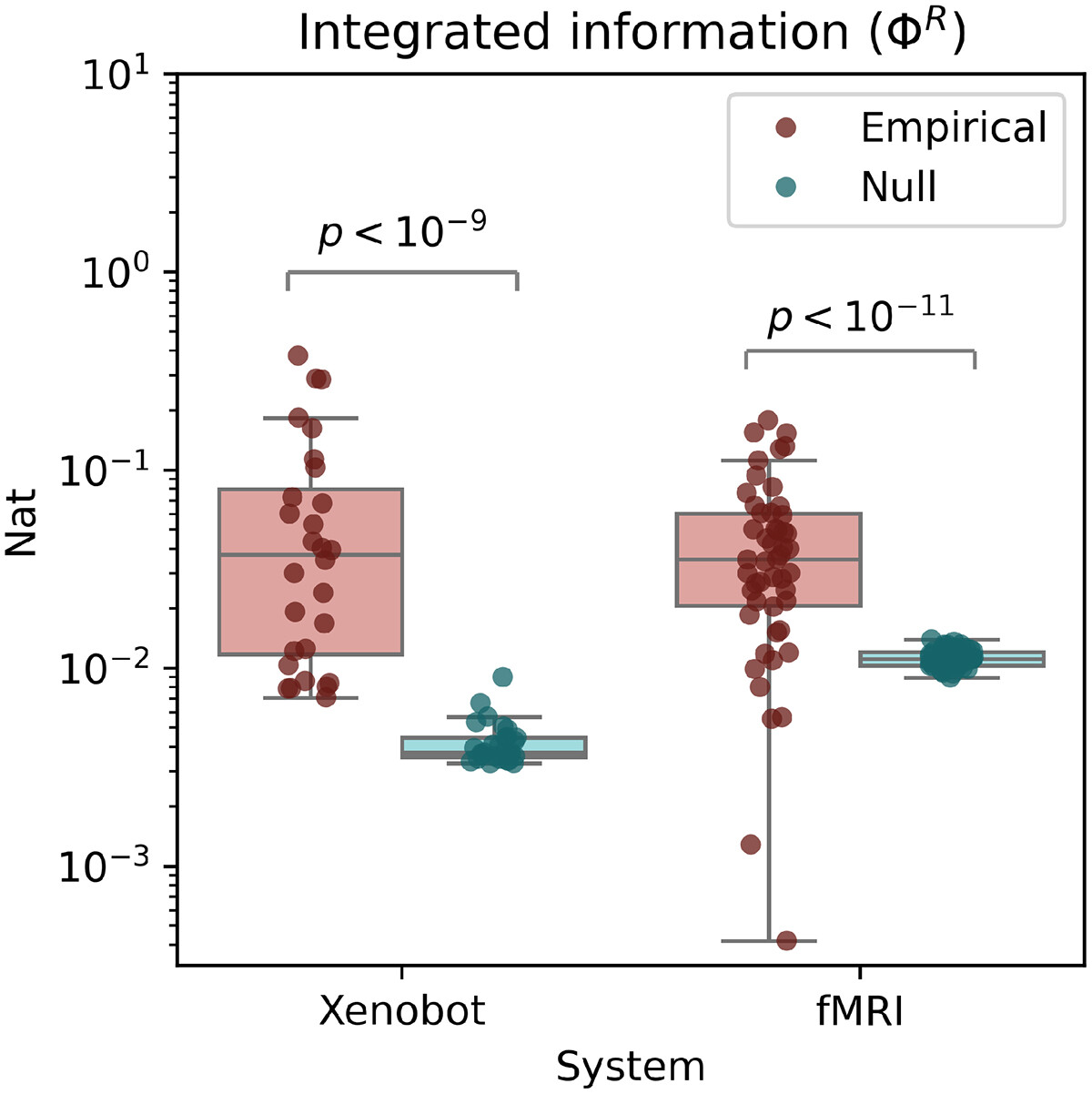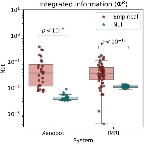 Figure 10. Integrated information (Φ𝑅). Both the basal Xenobots and the fMRI scans have significantly higher global integrated information than their respective nulls do. This shows that both systems display at least some dynamical properties in the “whole” that are not trivially reducible to lower-order “parts”.