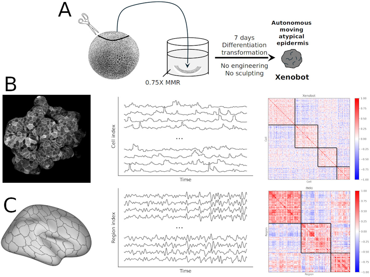 Figure 1. Data preparation and matrix construction. (A): This cartoon describes the production of basal Xenobots from frog embryonic tissue. Caps are excised by hand and cultured for seven days without perturbation; the resulting autonomously moving epidermal cell structure is a “basal” (i. e. unmodified) Xenobot. (B): The pipeline for learning functional connectivity patterns from basal Xenobots. Videos of the bots are segmented into individual cells, from which average calcium traces are extracted. The covariance matrix defines the functional connectivity, which can be organized into meso-scale communities following clustering. (C): The same pipeline, but for human brain data recorded with an fMRI; in this case, the elements are cortical regions (corresponding to the Schaefer 200 parcellation [Citation67]) and the signal is BOLD rather than calcium, but the overall pipeline remains the same.