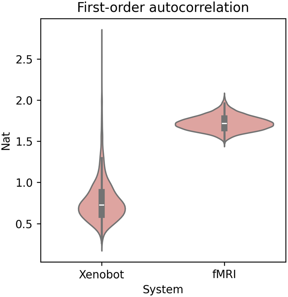 Figure 2. Autocorrelation. Violin plots of the distribution of autocorrelation over all brain regions (for the fMRI scans) and all cell calcium signals (for the basal Xenobot recordings). All cells and all brain regions had statistically significant autocorrelation.