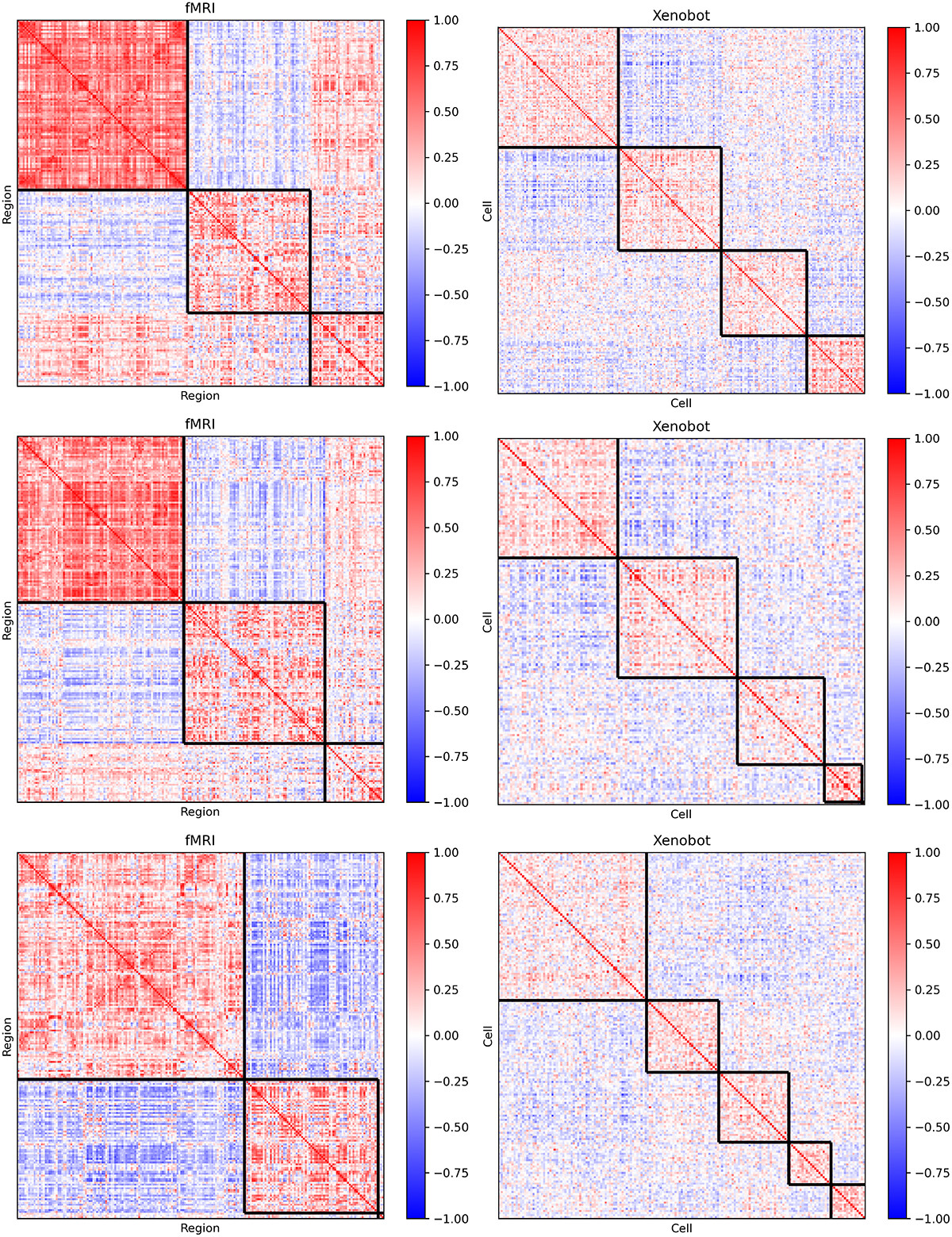 Figure 3. Sample communities. A set of sample functional covariance matrices, organized by the communities detected by the multi-resolution community detection algorithm [Citation73] (see materials and Methods 3.5). The on-diagonal squares (outlined in black) correspond to the communities. Three fMRI and three basal Xenobot matrices are shown. The full set of all clustered functional connectivity matrices, for basal Xenobots and fMRI scans Supplementary material.