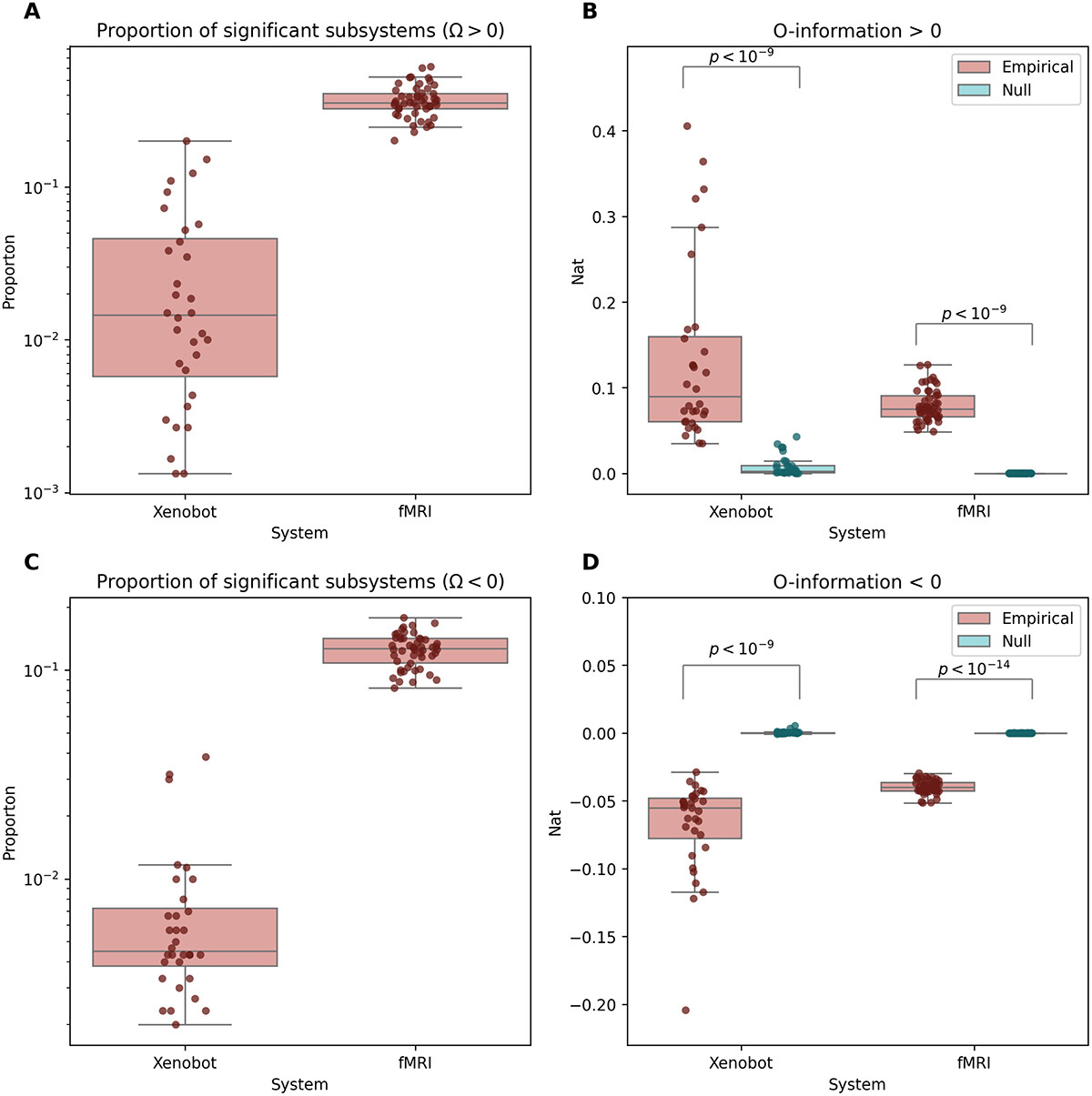 Figure 7. Positively- and negatively signed O-information. (A) The proportion of subsystems of size 3, 4, and 5 that had significant positive O-information (i.e. were significantly redundancy-dominated) for both basal Xenobots and fMRI scans. Both systems showed significant higher-order redundancy for multiple samples. (B) For positively signed samples, both fMRI scans and basal Xenobots showed significantly greater O-information than their autocorrelation-preserving nulls. (C) The proportion of systems of size 3, 4, and 5 that had significant negative O-information (i.e. were significantly synergy-dominated) for both system types. As with redundancy, both systems displayed significant synergy. (D) for negatively signed samples, both fMRI scans and basal Xenobot recordings showed more strongly negative O-information than their respective nulls.