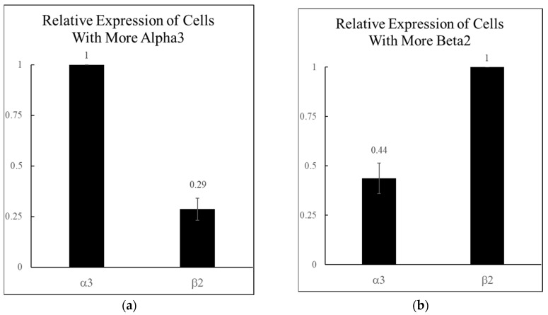 Figure 1. Relative levels of α3 and β2 nicotinic acetylcholine receptor (nAChR) mRNA expression in rat hippocampal interneurons. The most commonly co-expressed α and β subunits from Jackson et al. 2024 [6] were the α3 and β2 subunits (n = 36 neurons). These were analyzed further to identify two populations, depending on which subunit was expressed higher. (a) A total of 56% of the α3β2 expressing neurons had more α3, with a 3.45-fold α3:β2 mRNA ratio (n = 20 for (a)). (b) A total of 44% of the α3β2 expressing neurons had more β2 with a 2.27-fold α3:β2 mRNA ratio (n = 16 for (b)).