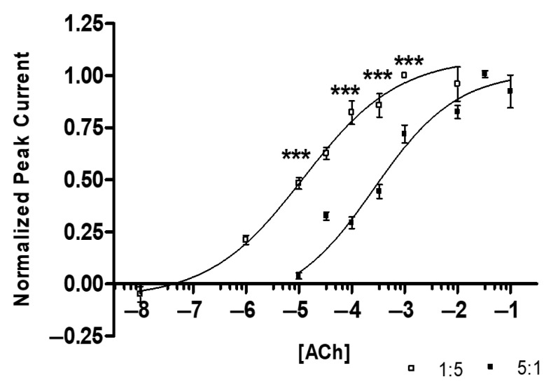 Figure 4. Acetylcholine (ACh) Dose–Response Curves: 1:5 (α3:β2) EC50 = 12.2 ± 1.7 μM, nH = 0.49 ± 0.13 (R2 = 0.74) (n = 14 oocytes, replicates of 4, 1 individual data point identified as an outlier and removed), 5:1 (α3:β2) EC50 = 263.8 ± 1.6 μM, nH = 0.55 ± 0.15 (R2 = 0.77) (n = 12 oocytes, replicates of 4, 2 individual data points outliers). Grubb’s outlier tests were used for outliers (alpha = 0.05). The 1:5 injected ratio has a minimum response at ~100 nM and an Emax at ~1000 µM ACh. The 5:1 injected ratio has a minimum response at ~10 µM and an Emax at ~33 mM ACh (ANOVA, F[15,258] = 54.644, *** p < 0.001).