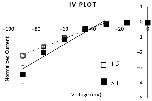 Figure 3. IV plot. The IV plot obtained from the α3:β2 1:5 mRNA-injected oocytes fit a linear trendline of y = 0.0356x + 1.033 (R2 = 0.9892) (dashed line, n = 5). The IV plot obtained from the α3:β2 5:1 mRNA-injected oocytes fit a linear trendline of y = 0.0537x + 1.7478 (R2 = 0.9362) (solid line, n = 8) when fitting the points between −90 mV and −30 mV (the linear part of the rectifying plot). The reversal potential for both is approximately −30 mV, with a strong inward rectification. ANOVA testing showed no significant difference between these IV responses.