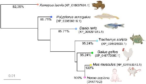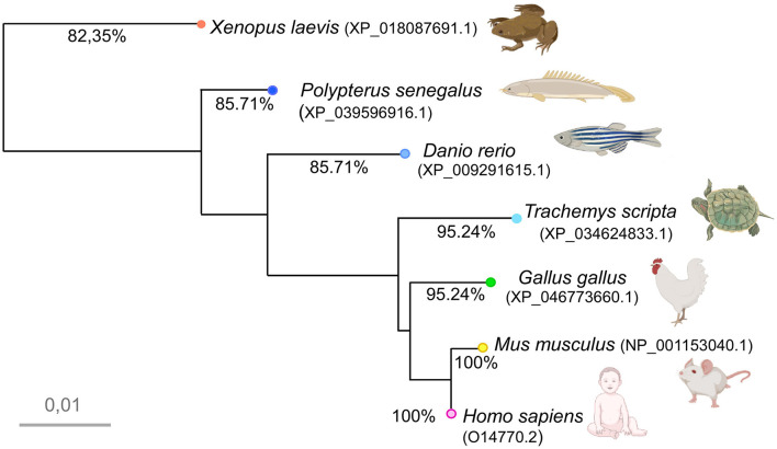Figure 2. Phylogenetic tree illustrating the relationships among the amino acid sequences of the transcription factor Meis2 in the indicated animal models based on a COBALT multiple alignment of the human Meis2 orthologs, as defined by the NCBI orthologs criteria. The accession number of each ortholog is provided under the species name in the diagram. The scale bar represents distance, and the percentage of calculated homology with human Meis2 (Uniprot Id: O14770.2) is shown in each terminal branch. Free images were obtained from BioRender or Adobe Stock and modified using CANVAS.