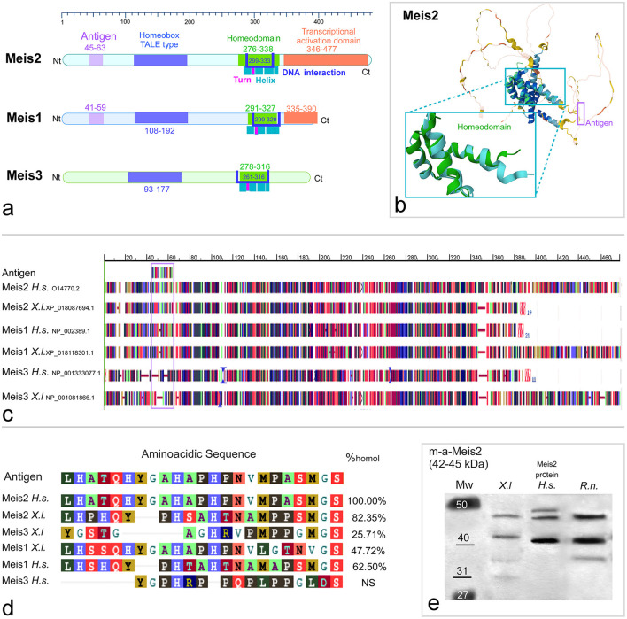 Figure 1. (a) Representation of the structure and main domains of the human Meis2, Meis1, and Meis3 proteins. The domains are labeled in Meis2 and the color code is maintained in Meis1 and Meis3. (b) The 3D structure obtained from the AlphaFold Protein Structure Database and PDBe-KB (Protein DATA Bank in Europe Knowledge Base) for human Meis2 Uniprot Id: O14770.2 Entrez Gene ID: 4212. The central part, including the homeodomain (cyan rectangle) and the Nt loop, contains the antigenic sequence recognized by the antibody used (violet rectangle). (c) Alignment of the Meis1, Meis2, and Meis3 orthologs between Homo sapiens and Xenopus laevis. (d) Percentage of homology with the amino acid sequence of the antigenic epitope for the Meis1, Meis2, and Meis3 orthologs in Xenopus laevis and Homo sapiens. (e) Western blot analyses of brain extracts from Xenopus (X.l), dilution of the purified Meis2 human protein (H.s), and Rattus norvegicus (R.n), stained with the mouse anti Meis2 antibody. Standard molecular weight (MW) is represented on the left side of the photograph.