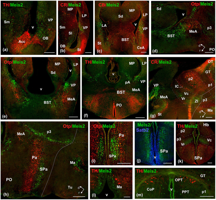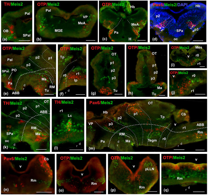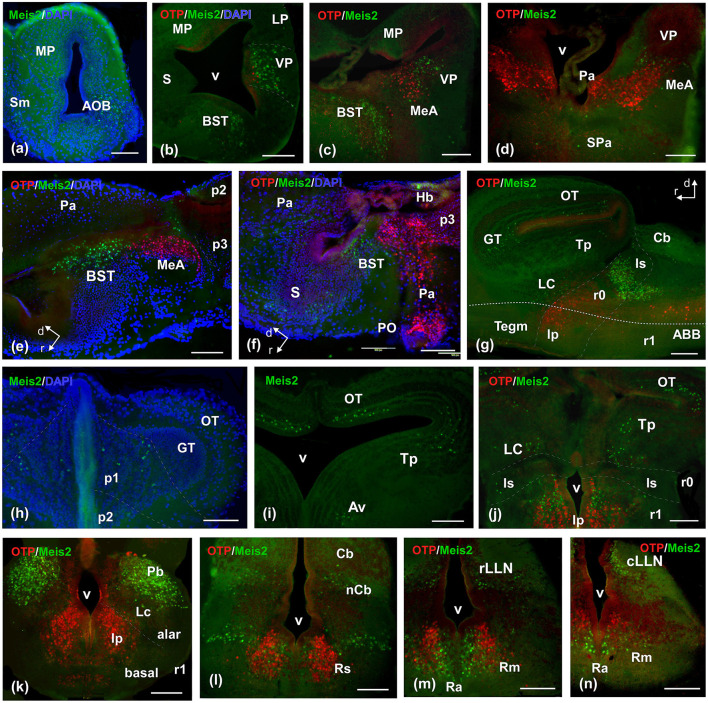 Figure 5. Photomicrographs of double-labeled transverse (a–d, h–n) and sagittal (e–g) sections at representative brain levels of Xenopus from stages 53–56. Topological dorsal and rostral orientations are indicated by rows, with respect to the alar-basal boundary (ABB), indicated by a rough dashed line in sagittal sections. In all photographs, green is Meis2ir, red is Otp, and blue is DAPI staining. Thin dashed lines represent the approximate boundaries within telencephalic, diencephalic, mesencephalic, and rhombencephalic subdivisions. See the list for abbreviations. Scale bar, all = 100 μm.