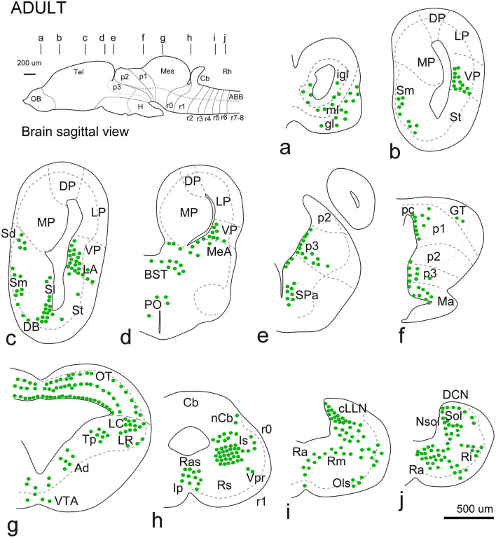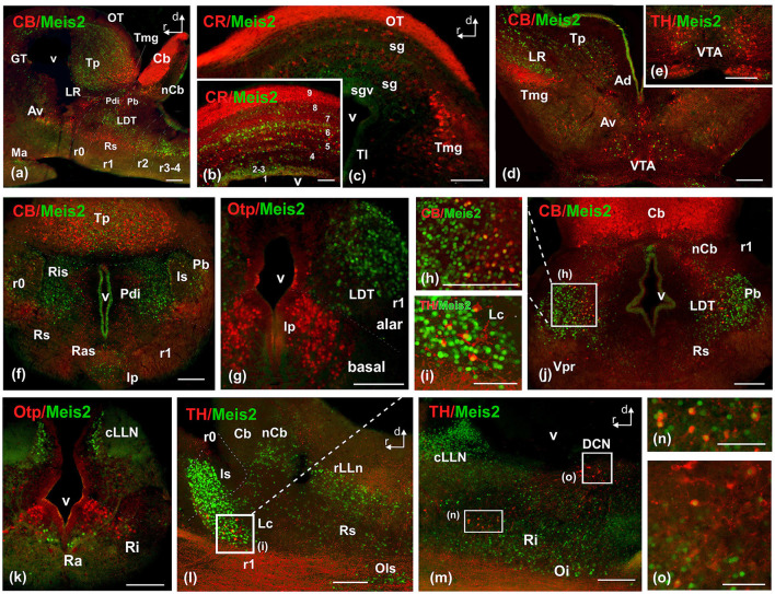 Figure 8. Photomicrographs of double-labeled transverse (a–c, e, f, i–m) and sagittal (d, g, h) sections at representative brain levels of Xenopus from stages 53–56. Image (h) is a magnification of (j) at the level of the laterodorsal nucleus. (i) is a magnification of the locus ceruleus in (l). Images (n) and (o) are magnifications of (m) at the reticular formation and DCN respectively. Topological dorsal and rostral orientations are indicated by rows. The alar-basal boundary (ABB) is indicated by a rough dashed line in sagittal sections. Color codes for the markers are indicated in the upper left corner of each photo. Thin dashed lines represent the boundaries within telencephalic, diencephalic, mesencephalic, and rhombencephalic subdivisions. See the list for abbreviations. Scale bar, no = 25 μm, rest = 100 μm.