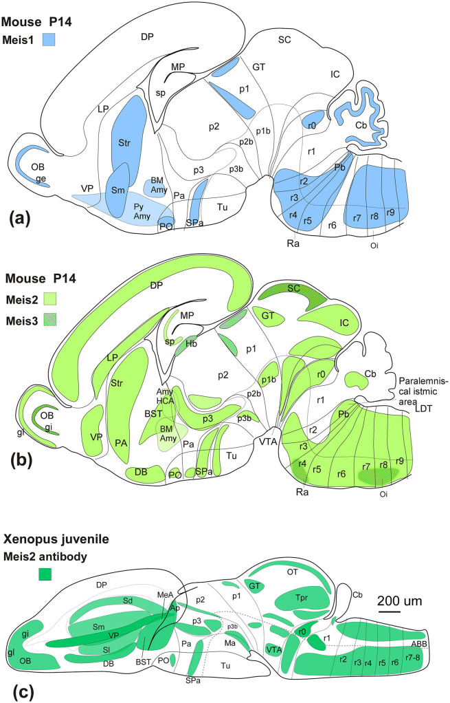 Figure 9. (a) Sagittal schematic diagrams representing the distribution of Meis1 (blue), (b) Meis2 (green), and Meis3 (dark green lines) in the mouse postnatal brain (Allen brain), compared to the distribution of Meis2-ir in the Xenopus brain (c). In all diagrams, dorsal is oriented upward and rostral is oriented to the left. The main subdivisions are indicated by thin lines. See the list for abbreviations.