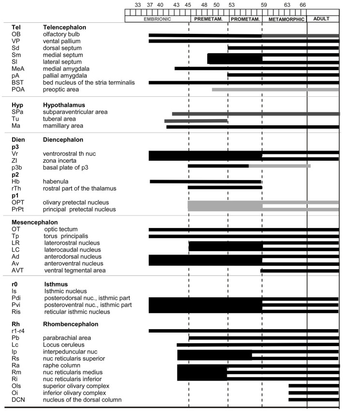 Figure 10. Timeline of the appearance of Meis2 cell groups in the developing brain of Xenopus laevis.