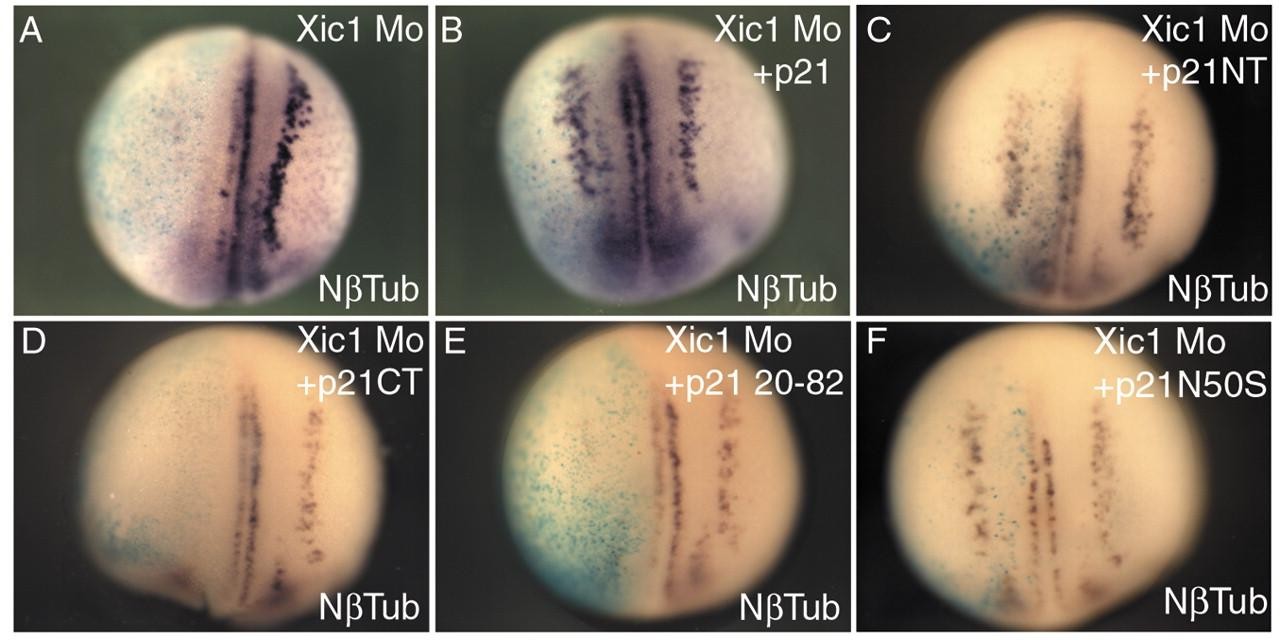 Fig. 3. p27Xic1 promotes primary neurone differentiation independently of its cell cycle role. Nβtub expression abolished by p27Xic1 Mo (A) is rescued by co-injection of p21Cip1 (B). Embryos were co-injected with p27Xic1 Mo and p21Cip1 NT (C), p21Cip1 CT (D), p21Cip1 20-82 (E) or p21Cip1 N50S (F). Co-injection with p21Cip1 NT (C) and or p21Cip1 N50S (F) rescued Nβtub, while p21Cip1 CT (D) and p21Cip1 20-82 (E) had no effect.