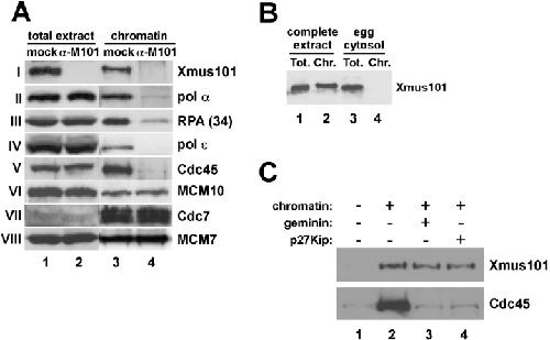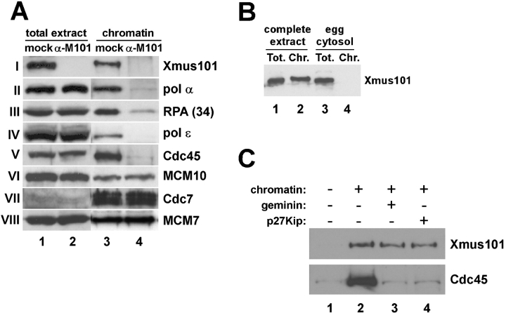 Figure 2. Xmus101 is required for the loading of Cdc45 onto chromatin during the initiation of DNA replication. (A) Immunoblot of either total extract samples from mock-depleted (mock, lane 1), or Xmus101-depleted (α-Xmus101, lane 2) extract, or chromatin isolated after a 45-min incubation in either mock- (mock, lane 3), or Xmus101-depleted (α-Xmus101, lane 4) extract. The blots were probed with antibodies against Xenopus Xmus101 (panel I), pol α (pol α p60 subunit, panel II), RPA (the 34-kD subunit, panel III), pol ɛ (pol α p70 subunit, panel IV), Cdc45 (panel V), MCM10 (panel VI), Cdc7 (panel VII), or the MCM7 component of the MCM2-7 complex (panel VIII). (B) Immunoblot of complete egg extract, both total extract (Tot.) and the isolated chromatin fraction (Chr.), and membrane-free egg extract, or egg cytosol, both total extract and the isolated chromatin fraction. (C) Egg extracts were prepared and supplemented with sperm chromatin (lane 2), or sperm chromatin plus recombinant geminin (500 nM, lane 3), or sperm chromatin plus recombinant p27Kip (500 nM, lane 4). After a 45-min incubation, the chromatin was isolated and probed, by immunoblotting, for the presence of Cdc45 and Xmus101. Lane 1 shows a reaction lacking sperm chromatin.
