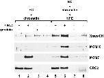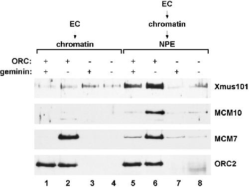 Figure 3. Xmus101 requires ORC for association with sperm chromatin. In lanes 1–4, egg cytosol (EC) that either contained or lacked ORC, as indicated, was mixed with sperm chromatin and incubated for 30 min. The chromatin was then isolated and probed by immunoblotting for the presence of Xmus101, MCM10, MCM7, or ORC2. In lanes 5–8, egg cytosol that either contained or lacked ORC, as indicated, was mixed with sperm chromatin and incubated for 30 min. After incubation, NPE that either contained or lacked ORC, as indicated, was then added and incubation continued for an additional 30 min before isolation of the chromatin and immunoblotting for the indicated factor. The NPE contained the replication inhibitor aphidicolin, to trap assembled replication complexes and prevent disassembly following the completion of DNA replication.