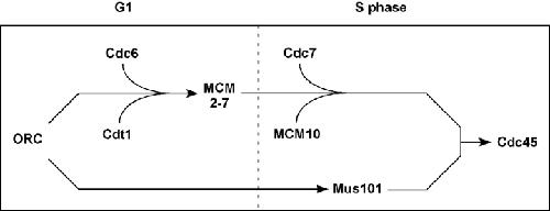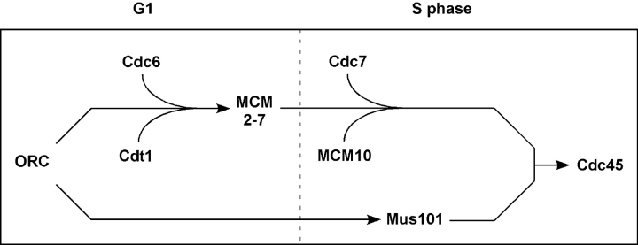 Figure 5. A model for the replication initiation pathway. The data presented here suggest two parallel pathways, one MCM2-7 dependent, the other Mus101 dependent, which cooperate to load Cdc45 at the G1/S transition. See Discussion for details.