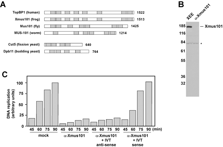 Figure 1. Xmus101 is required for DNA replication in Xenopus. (A) The Mus101 protein family. Shown are schematic depictions of Mus101-related proteins from divergent organisms. The shaded gray boxes indicate the position of the BRCT domains, and the numbers to the right indicate the size of the protein, in amino acids. For comparison, the domain structure of budding yeast Dpb11 and fission yeast Cut5 is also shown. (B) Immunoblot analysis of Xenopus egg extract (XEE), or egg extract that had been immunodepleted of Xmus101 (α-Xmus101), probed with affinity-purified anti-Xmus101 antibodies. The asterisk denotes a background band recognized by the antibody that is not diminished in the depleted extract. The numbers to the left of the gel denote the migration position and molecular mass, in kD, of molecular mass markers. (C) Egg extracts were prepared, and then depleted of Xmus101 protein (α-Xmus101) or mock-depleted (mock). Additionally, Xmus101-depleted extracts were supplemented with in vitro transcription and translation (IVT) reactions programmed by the Xmus101 cDNA. In vitro transcription was performed in either the sense, or anti-sense orientation. Sperm chromatin was then added, along with 32P-dATP, and DNA replication in the given extract was measured at the indicated times. The graph depicts the amount of DNA replication observed after quantification of the dried gels by PhosphoImager analysis. The data shown are from a single experiment, and are representative of four independent trials. The amount of replication observed in the mock-depleted sample at the 90-min time point was set to 100, and all other values adjusted accordingly.