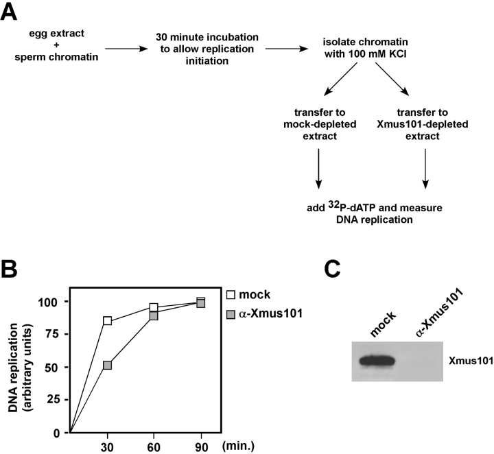 Figure 4. Xmus101 is dispensable for DNA replication after initiation is complete. (A) Experimental scheme, see text for details. (B) DNA replication was measured in the given extract at the given time. (C) Immunoblotting of either mock-depleted (mock), or Xmus101-depleted (α-Xmus101) extract after transfer of the chromatin, showing that no detectable Xmus101 is transferred along with the chromatin.