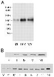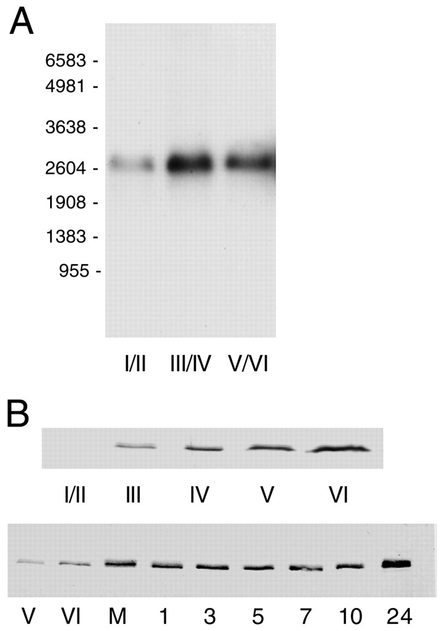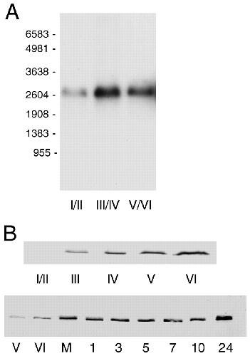 Temporal expression of VgRBP71. (A) Oocytes were separated into three groups according to the designated Dumont stages and total RNA isolated for northern blot analysis. Each lane contains 10 oocyte-equivalents of RNA. The positions of RNA size standards (nt) are indicated. (B) Staged oocytes or embryos were homogenized and two oocyte/embryo equivalents were run per lane in a western blot assay. The numbers below each lane refer to the developmental stage of the oocytes (Dumont, 1972) or embryos (Nieuwkoop and Faber, 1956). M indicates stage VI oocytes matured by treatment with progesterone.