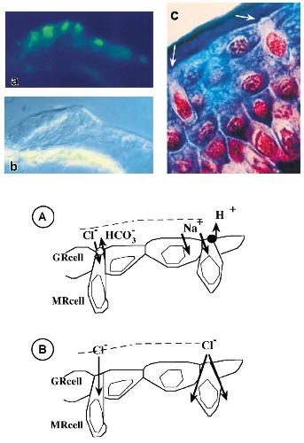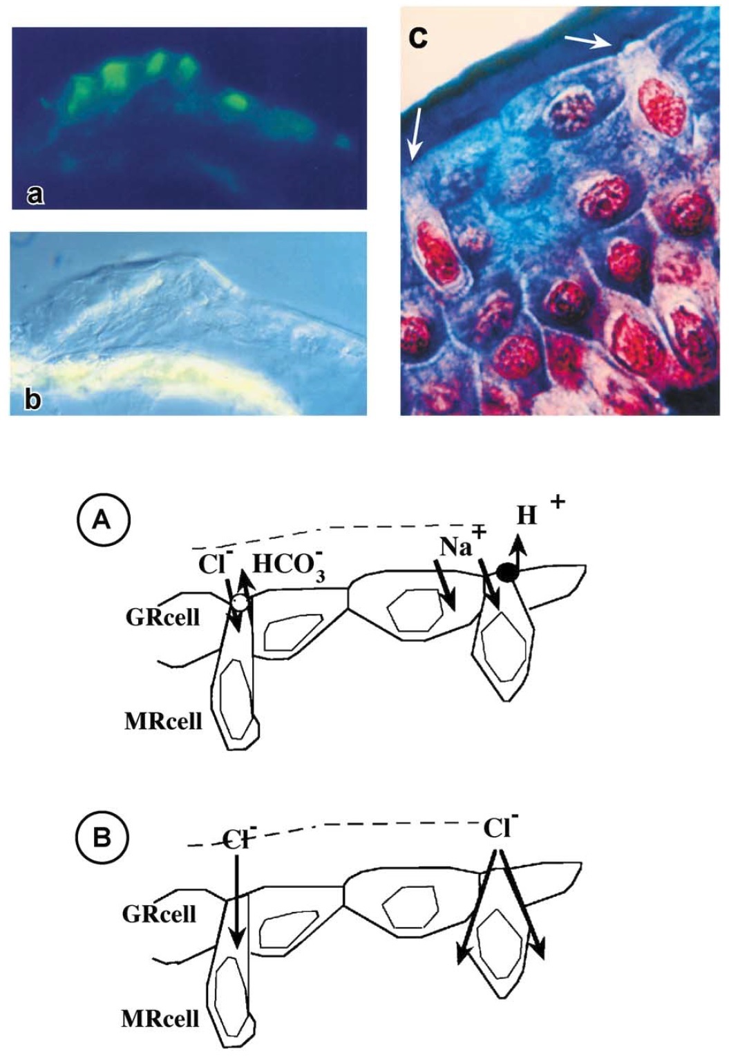 layer (c). Lower part: (A) Model of ion reabsorption from low salt containing media. The electrogenic proton pump (V-ATPase) in MR cells energizes the Na+