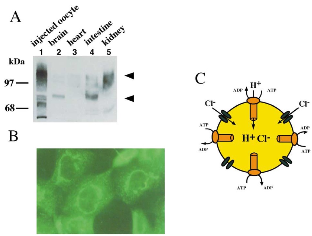 Ref. [81]. Bands of different molecular weights could be detected in xClC-5 cRNA-injected oocytes, kidney, intestine, and brain. The highest band (130 kDa,
