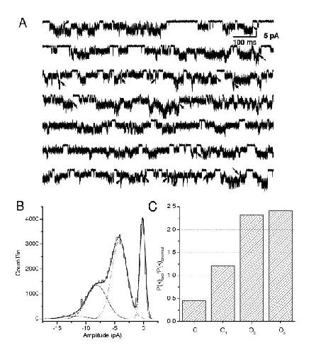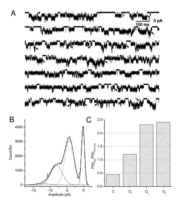 Figure 1. Typical current from a multiple-channel patch. (A) The outside-out patch current activated by 10 μM ATP recorded at -120 mV from a Xenopus oocyte. The data were sampled at 10 kHz and filtered at 5 kHz. There are at least three channels active in this patch as indicated by the open level of current. There are a surprising number of what appear to be nearly simultaneous openings and closings, some of which are marked by arrows. These occurrences are the indication of channel interactions. The convention in this paper is that inward currents are downward. (B) The all-points amplitude histogram of currents from panel A (0.15 pA/bin). The distribution was fit by a sum of four Gaussians (lines), with means of 0, 4.1, 7.9 and 11.9 pA, representing the closed, 1st, 2nd, and 3rd open levels. The open channel noise of each level was ~1.2 pA. The probabilities, P(k)exp, that all channels are closed, one, two, and three channels are open from histogram are 0.210, 0.487, 0.270, 0.027, respectively in this patch. (C) Comparison of P(k)exp with P(k)binomial from the binomial distribution (Eq. 5). The ratio of P(k)exp/P(k)binomial increases with increasing k.