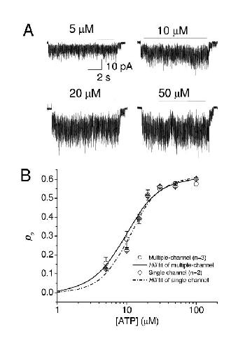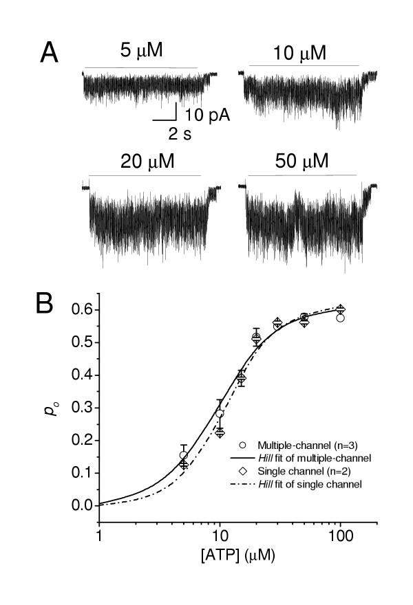 Figure 2. Dose-response curves of currents from multiple- and single channel patches. (A) Multiple channel currents activated by different ATP concentrations at -120 mV. The data were sampled at 10 kHz and filtered at 5 kHz. The bar indicates the application of ATP. (B) The dose-response curve of multiple channel currents (Circles, n = 3) and single channel currents (Diamonds, n = 2) recorded from outside-out patches. The multiple channel currents were normalized to the peak value of currents activated by 100 μM ATP and rescaled to the same po,max as the single channel current. po of single channel currents (Diamonds) were calculated from the all-points histogram (see Figure 4). The solid line is a fit of the Hill equation of multiple channel currents with an EC50 of 9.8 ± 0.8 μM and a Hill coefficient of 1.91 ± 0.29. The dash-dot line is the fit of the Hill equation of single channel currents with an EC50 of 11.2 ± 1.0 μM, a Hill coefficient of 2.3 ± 0.44, and po,max of 0.61.