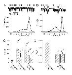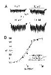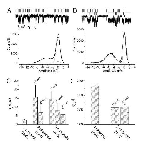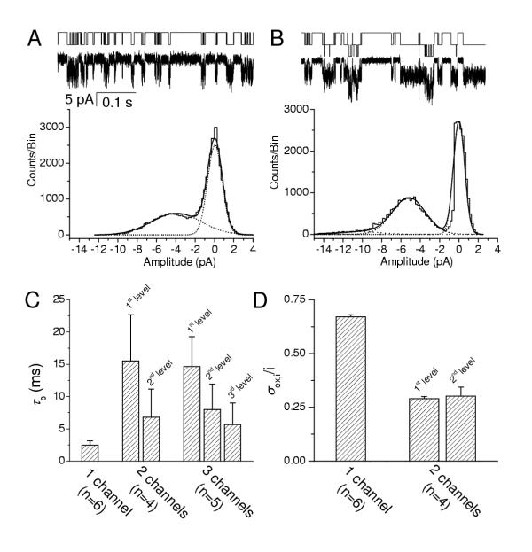Figure 3. Mean open channel lifetimes of currents from multiple channel currents and single channel currents. The currents were recorded from Xenopus oocytes at -120 mV in divalent free perfusion solutions and were sampled at 20 kHz and filtered at 5 kHz. (A) Single channel current (left) shown with the idealized current above and the histogram below. The mean amplitude and open channel noise are 4.1 pA and 2.4 pA. (B) Currents from a patch containing two channels (left) with the idealized currents shown above and the histograms below. The mean amplitude and open channel noise are 4.8 pA and 1.5 pA. (C) Mean open lifetimes of currents from patches containing one (n = 6), and two (n = 4) and three (n = 5) opening levels. (D) The relative open channel noise of single channel currents and of the 1st and 2nd opening levels of multiple channel currents. The amplitude difference between 1st and 2nd level of multiple channel currents is insignificant. However, the noise of multiple channels (either 1st or 2nd level) and single channel currents is significantly different (p > 0.05, t-test).