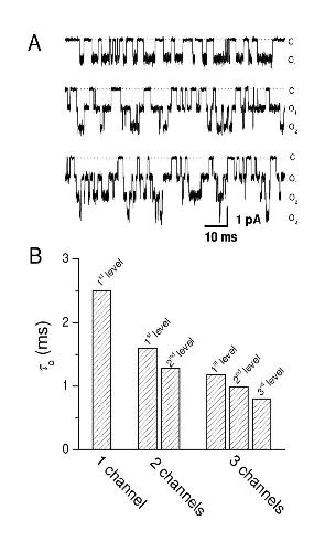 Figure 4. Simulated currents containing one, two, three channels, and mean times of each open level. (A) Simulated currents containing one (top), two (middle) and three (bottom) independent channels. We used a two state model (Scheme 1) with α = 250 s-1, and β = 400 s-1 to simulate the currents. The simulated currents were sampled at 100 kHz and filtered with a digital filter of 10 kHz. The mean closed and unitary current amplitude set to 0 and 1 pA respectively. We set the standard deviation for closed and open level of 0.1 and 0.3 pA to mimic the large open channel noise of P2X2 receptors. Oi represents the nth open level for multiple channel currents. (B) The mean times of each open level from 5 s of simulated data.