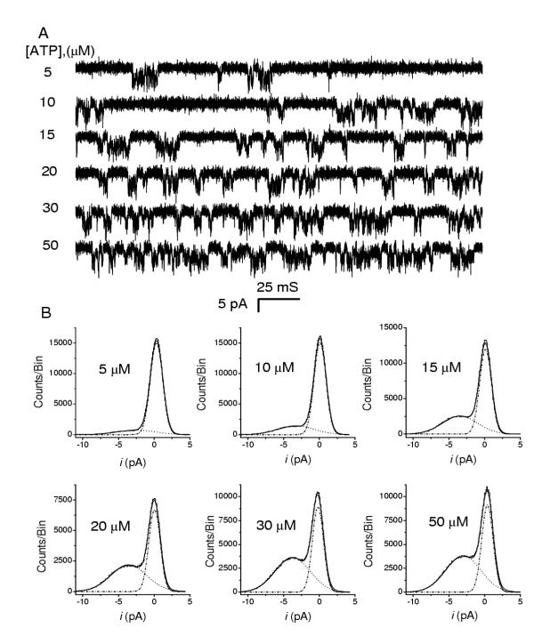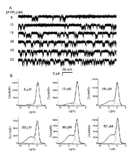 Figure 5. Open channel noise is independent of ATP concentration. (A) Single channel currents recorded at -120 mV from a Xenopus oocyte activated by different concentrations of ATP as indicated in the figure. The data were filtered at 10 kHz and sampled at 40 kHz. The perfusion solution contained no divalent ions. All of the current traces in this figure are from the same patch. This patch contained one channel because there is no overlap of current in all the range of ATP concentrations. (B) The all-points amplitude histograms of the currents from panel A (0.05 pA/bin), with the distributions fit to the sum of two Gaussians. The dot, dash dot, and solid lines are the fits of open peak, closed peak, and the summation of two Gaussians. The fitting parameters are listed in Table 1.