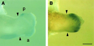 Figure 3. Expressions of shh in recombinants with anterior (A) and posterior (B) mesenchyme. Expression of shh was found only in recombinants with posteriormesenchyme. Arrowheads show the hostâgraft boundary. a, host anterior side; p, host posterior side. Scale bar = 250 μm in B (applies to A,B).