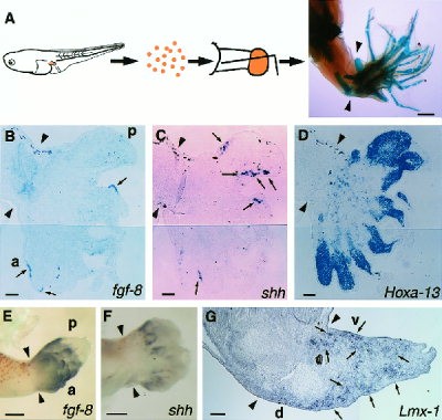 Figure 1. A: Preparation of Xenopus recombinant limbs. Recombinants with whole limb bud mesenchyme at stage 55â56 formed many digits. BâG: Gene expressions in recombinants. Expressions of fgf-8 (B), shh (C), and Hoxa-13 (D) were examined by in situ hybridization in serial sections at 8 days after grafting. Expressions of fgf-8 (E) and shh (F) were also examined by whole-mount in situ hybridization at 5 days and 8 days after grafting, respectively. G: Lmx-1 expression was examined by in situ hybridization on a section at 8 days after grafting. Arrowheads show the hostâgraft boundary. Arrows indicate expression domains. a, host anterior side; p, host posterior side; d, host dorsal side; v, host ventral side. Scale bars = 1 mm in A, 250 μm in E,F, 100 μ m in BâD,G.