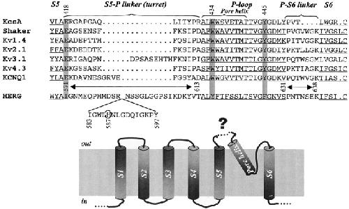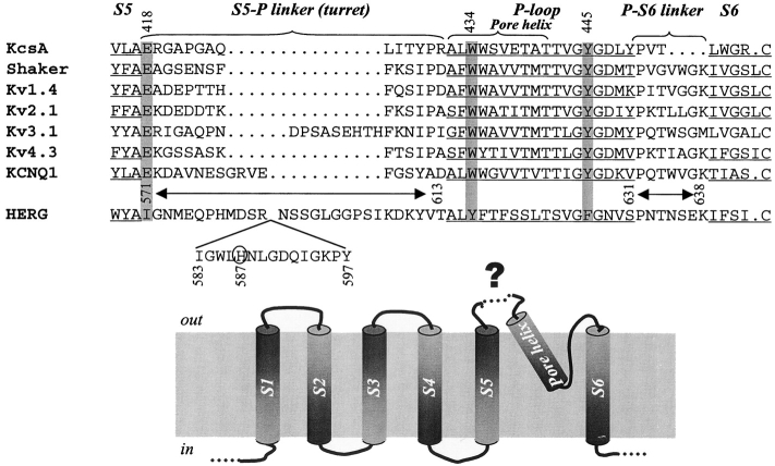 Figure 1. . (Top) Alignment of amino acid sequences from the end of S5 to the beginning of S6 of HERG, major classes of voltage-gated K (Kv) channels, and KcsA. Transmembrane and pore (P)-loop regions are underlined. S5 and S6 correspond to M1 and M2 of KcsA, respectively. S5-P linker (“turret” of KcsA) and P-S6 linker (P-M2 of KcsA) are marked. Gaps (…) are introduced to improve alignment. Amino acids in the Shaker channel implicated in hydrogen bonding and critical for maintaining the outer mouth in the open state are highlighted by gray shade: E418, W434, and Y445 (Shaker position numbers shown on top). Note that these amino acids are conserved in KcsA and all major classes of Kv channels, but not in HERG. The HERG positions examined here (571–613 of S5-P linker, and 631–638 of P-S6 linker) are marked above its sequence. Positions 583–597 are shown as an insert. H587 in HERG is circled (see text for discussion). (Bottom) Transmembrane topology of one Kv channel subunit. The structure of the unusually long extracellular S5-P linker of HERG (marked by a dotted line and “?”) is the major focus of this study.