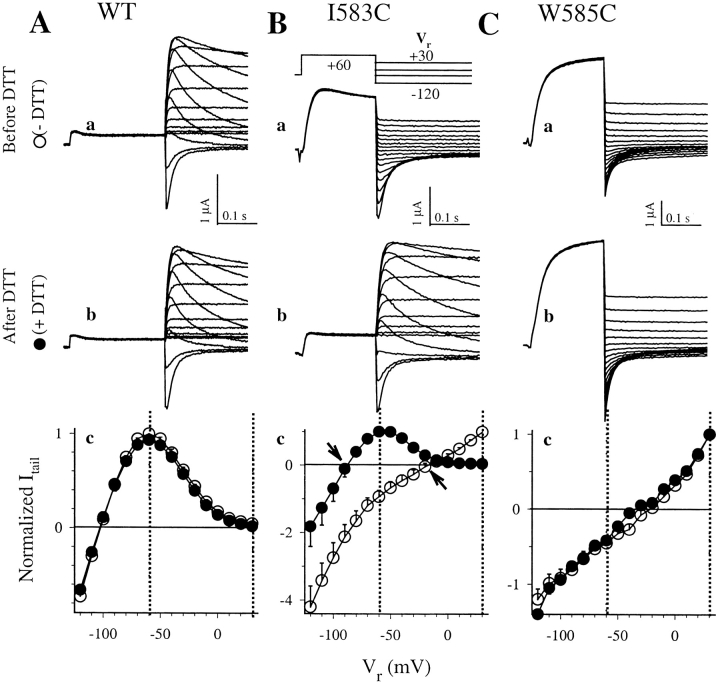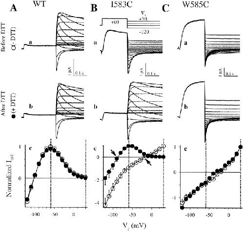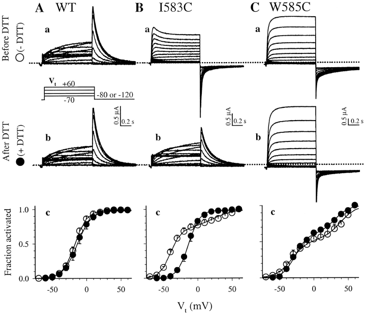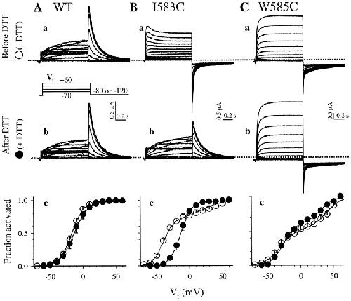 Figure 5. . Effects of cysteine substitution at positions 583 and 585 on the voltage dependence of activation. The voltage clamp protocol is shown in the middle of column A. Superimposed original current traces recorded before DTT treatment (panels a), and after DTT treatment (panels b) from the same oocytes are depicted. Dotted lines denote the zero current level. Panels c illustrate 1-s isochronal activation curves averaged from 5–7 oocytes per group. For each oocyte, tail current amplitudes after depolarization to different levels of Vt are measured and normalized by the maximal tail current after Vt to 60 mV. This gives an estimate of the fraction of channels activated at the end of Vt. The relationship between Vt and “fraction activated” is fit with a single (WT, and I583C after DTT) or double (I583C before DTT, and W585C before/after DTT) Boltzmann function: Fraction activated = A1/{1 + exp[(V1 − Vt)k1]} + A2/{1 + exp[(V2 − Vt)/k2]}, where Ai, Vi, and ki are the fraction, half-maximum activation voltage and slope factor of ith Boltzmann component. For single Boltzmann function, i = 1 only. The superimposed activation curves are calculated from appropriate Boltzmann function with mean parameter values.