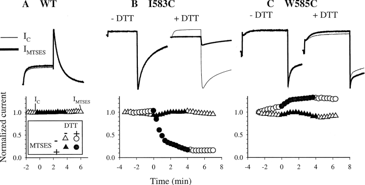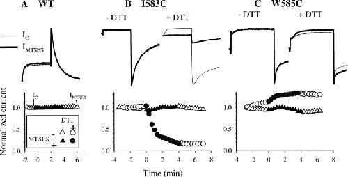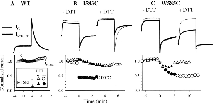 Figure 3. . MTSET has no effects on WT HERG (A), and its effects on I583C (B) and W585C (C) are enhanced by DTT pretreatment. In each panel, the upper part illustrates superimposed current traces under the control conditions (IC, thin trace) and after MTSET treatment (IMTSET, thick trace). IC is measured right before MTSET exposure, and IMTSET is measured after MTSET washout. An example of the time points at which IC and IMTSET are sampled is denoted in the time course of A. WT HERG has no DTT-treatment. I583C and W585C are either not DTT-treated (−DTT), or DTT-pretreated (+DTT, 5 mM for up to 4 h). −DTT and +DTT data are from different cells. The lower parts show time courses of changes in the peak amplitude of tail current before, during and after MTSET exposure from the same experiments as shown in the upper parts. Time zero marks the beginning of MTSET (1 mM) superfusion. Open symbols are data points recorded before and after MTSET exposure, whereas closed symbols are those during MTSET exposure. Triangles denote data from cells without DTT treatment, and circles are data from cells pretreated with DTT. (A) WT HERG recorded in 2 mM [K]o, channel is activated by 1-s depolarization pulses to 20 mV, and tail currents are recorded at −80 mV. (B) I583C recorded in 2 mM [K]o, activated by 1-s depolarization to 60 mV, tail currents recorded at −80 mV. (C) W585C recorded in 98 mM [K]o, activated by 1-s depolarization to 20 mV, tail currents recorded at −120 mV.
