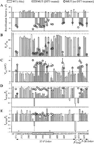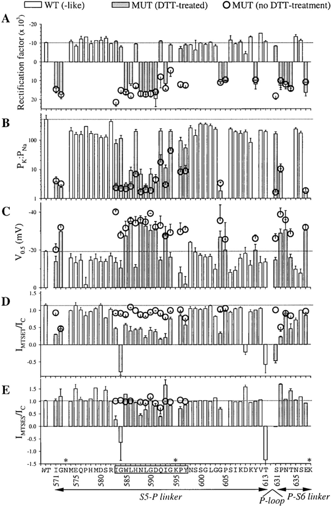 Figure 6. . Summary of effects of cysteine substitutions in the S5-P and P-S6 linkers of HERG on the degree of C-type inactivation (A), K+ ion selectivity (B), half-maximum activation voltage (C), response to MTSET (D), and response to MTSES (E). For all panels, white histogram bars denote data from WT HERG and WT-like mutants, gray histogram bars are data from mutants with altered behavior (MUT) after DTT treatment (5 mM, up to 4 h), and open circles are data from MUT without DTT treatment. Dotted lines are drawn across the WT data to facilitate comparison. Data are plotted against WT residues along the abscissa, with selected position numbers marked. The 583â597 segment is boxed. The channel domains (S5-P and P-S6 linkers, with P-loop in between) are also denoted. Asterisk indicates no expression (N573C, K595C, and K638C). (A) The degree of C-type inactivation is measured by a ârectification factorâ calculated from the normalized tail I-V relationship as shown in Fig. 2: Rectification factor = [(I+30 â Iâ60)/90], where I+30 and Iâ60 are the normalized tail currents at +30 and â60 mV, respectively. (B) K+ ion selectivity is measured by the permeability ratio of K+ to Na+ (PK/PNa). This is calculated from the reversal potential (Erev) measured in 2 mM [K]o and 96 mM [Na]o based on the constant field equation: Erev = RTln[(α[K]o + [Na]o)/(α[K]i + [Na]i)], where α = PK/PNa, [K]i and [Na]i are assumed to be 125 and 10 mM, respectively, R is the gas constant, and T is the absolute temperature. PK/PNa is plotted on a logarithmic scale. Current amplitudes of P605C, Y611C, N633C, and T634C in 2 mM [K]o are too small for a reliable measurement of Erev. (C) Half-maximum activation voltage (V0.5) is obtained by fitting a Boltzmann function to 1-s isochronal activation curves as described for Fig. 5. When there are two Boltzmann components, the V0.5 values reported here correspond to those of the negative (major) component. (D) Effects of MTSET are evaluated by ratio of IMTSET to IC. These current amplitudes are measured as shown in Fig. 3. (E) Effects of MTSES are evaluated in the same manner as described for MTSET, with IC and IMTSES measured as shown in Fig. 4. The negative values of IMTS/IC for G584C, D609C (MTSET but not MTSES), T613C, and S631C indicate a change in tail current direction at â80 mV from outward (IC) to inward (IMTS) (see Fig. 8).