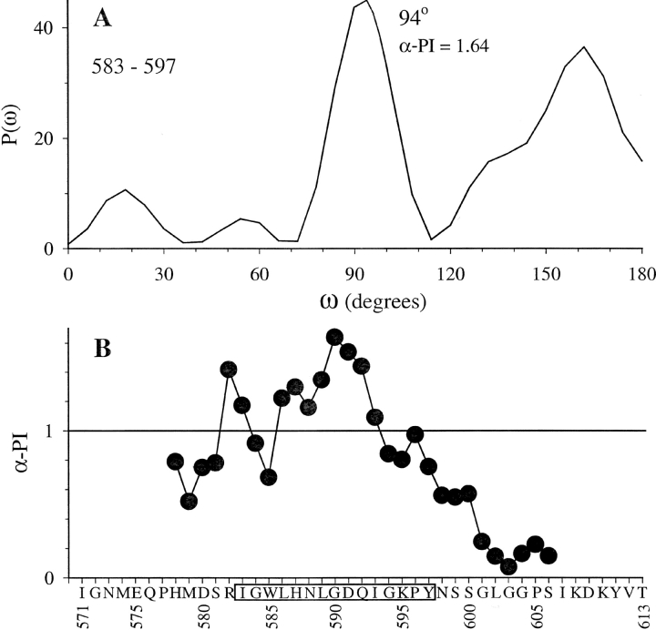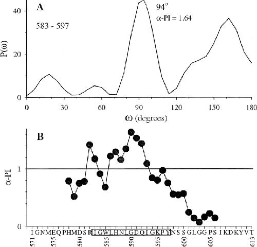 Figure 7. . Analysis of α-helical periodicity in the S5-P linker based on perturbations of activation gating induced by cysteine mutations (data from DTT-treated channels). The methods of calculating the Fourier transform power spectrum (P(ω) vs. ω) and α-periodicity index (α-PI) are described in materials and methods. (A) Fourier transform power spectrum of |ΔΔGo| values for the segment of 583–597 (value for the nonfunctional K595C is taken from <V>). (B) Windowed α-periodicity index analysis of S5-P linker of HERG. The α-PI values are calculated with a 15-residue sliding window and plotted against WT residues with selected position numbers along the abscissa (putative α-helix “583–597” is boxed).