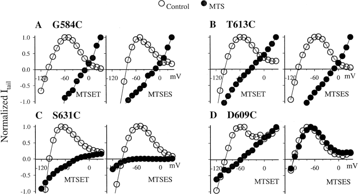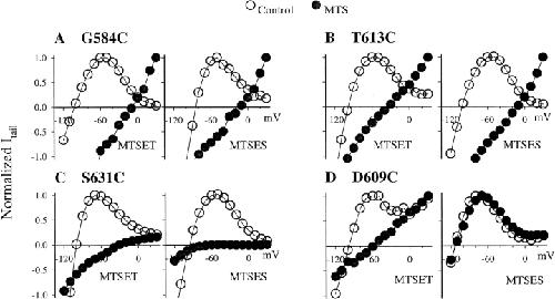Figure 8. . Effects of MTSET and MTSES on the I-V relationship and Erev of four cysteine mutants: G584C (A), T613C (B), S631C (C), and D609C (D). In all cases oocytes have been DTT treated. The recording conditions, voltage clamp protocol, and data analysis are the same as those described for Fig. 2. After control data (open circles) are obtained, the cells are exposed to MTSET (1 mM) or MTSES (1 mM) while the channels are activated by constant pulses from Vh −80 to 20 mV for 1 s once per 30 or 60 s till changes in currents reach a steady state. The MTS reagents are washed out for ≥10 min and then currents after MTS modification (closed circles) are recorded.