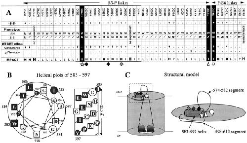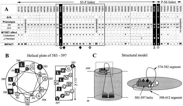 Figure 9. . (A) Summary table of effects of cysteine substitutions in the S5-P and P-S6 linkers on HERG channel function and response to MTSET. -S-S-, cysteine thiol side chains capable of forming disulfide bonds (+), or not (−). ?, data not conclusive. Phenotype, WT-like (W, strong C-type inactivation and high K+ selectivity) or mutant (M, disrupted C-type inactivation and low K+ selectivity), evaluated when thiol side chains are in reduced state (−SH) or in disulfide bonded state (-S-S-). M?, cysteine mutants have mutant behavior but the status of cysteine side chains unclear. /, not applicable because the introduced thiol side chains cannot form disulfide bonds. MTSET effect, decrease in channel conductance (downward arrow) or a switch of channel phenotype from WT-like to mutant (S). –, no effect. The 583–597 segment is boxed. G584C, W585C, G590C, I593C, T613C, and S631C are highlighted by different symbols below the table. (B) Plots of α-helical wheel (left) and α-helical net (right) of the 583–597 segment. Position numbers are labeled. Hydrophobic side chains are shaded gray. Hydrophilic side chains and glycine have no shade. Squares denote high-impact positions, while circles denote intermediate-impact positions. (C) Proposed structural model of HERG's pore domain. (Left) The helix formed by residues 583–597 is represented by a short cylinder. Symbols correspond to those in A and represent G584, W585, G590, I593, T613, and S631. For clarity, only one each of 583–597 helix, T613 and S631 are drawn for the channel. The HERG channel pore is drawn as a right side up “teepee” to reflect the following points: (1) The outer mouth of HERG may be narrower than that of Shaker or KcsA due to (a) a lack of important hydrogen bonds that can stabilize the outer mouth in the open state, and (b) the insertion of extra sequences from the S5-P linkers. (2) The inner mouth of HERG may be wider than that of Shaker or KcsA because it can accommodate drug molecules of large sizes (Mitcheson et al., 2000). (Right) An enlarged view of the boxed area. The model has the 583–597 helix orientated parallel to the plane of the cell membrane, with its NH2 end situated close to the pore entrance, so that G584 (star), like the two positions at the two ends of the P-loop, T613 (triangle) and S631 (circle), sits at the edge of extracellular pore entrance, with residues W585, G590, and I593 (diamonds) capable of interacting with a bound scorpion peptide toxin, ErgTx (Pardo-Lopez et al., 2002). The 574–582 segment forms an extracellular loop of low-impact positions. The 598–612 segment returns from the carboxyl end of the 583–597 helix to the pore, and along the way makes contacts with the outer surface of the channel at high- and intermediate-impact positions (604 and 609, respectively).