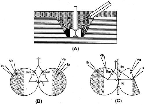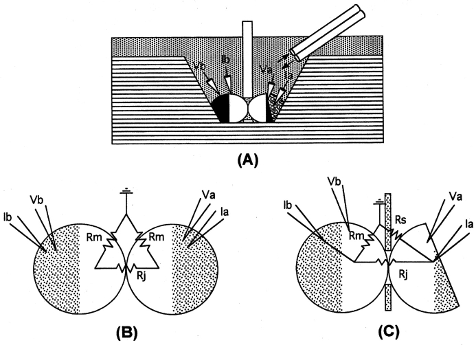 Figure 1. Schematic representation of the dual oocyte perfusion apparatus that allows both cytoplasmic access to gap junction channels and monitoring of intercellular conductance. The chambers, designed by F. Cao, B.J. Nicholson, and G. Nottingham (Cao, 1997), are assembled from two halves to form compartments that remain separated by a thin coverslip with a small (0.7-mm diam) hole drilled centrally (A). Oocytes, in 600 µl of L15 media per compartment, establish coupling through the hole in the coverslip, with which the oocyte membrane forms a low resistance seal. During perfusion experiments, one oocyte is cut open with fine dissecting scissors, and at this time, the seal resistance replaces the membrane resistance of the open cell as shown in the equivalent circuit (B and C).