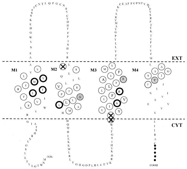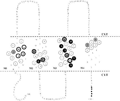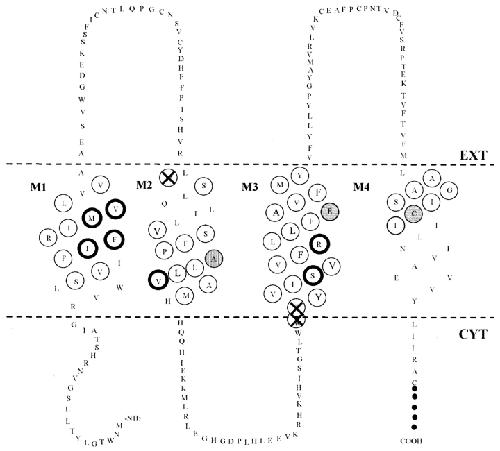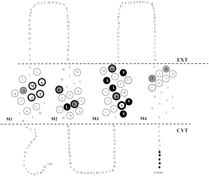 Figure 8. Position of all significantly reactive cysteines in Cx32. Solid filled circles in M2 and M3 indicate sites where channel block by MBB was highly significant (P < 0.01), whereas boldly circled residues with lighter shading (V84 and L89 in M2; F141 and Y151 in M3) showed conductance changes that were slightly less significant (0.01 < P < 0.05). Lightly shaded residues in M1 (I33) and M4 (A196 and S198) showed block in response to extracellular MBB application, and are not thought to line the pore. Boldly circled open sites indicate reactive positions where cysteine substitution induced reversed gating. Reactivity of these residues suggests that they are accessible in the closed state, but not necessarily in the native, open conformation.
