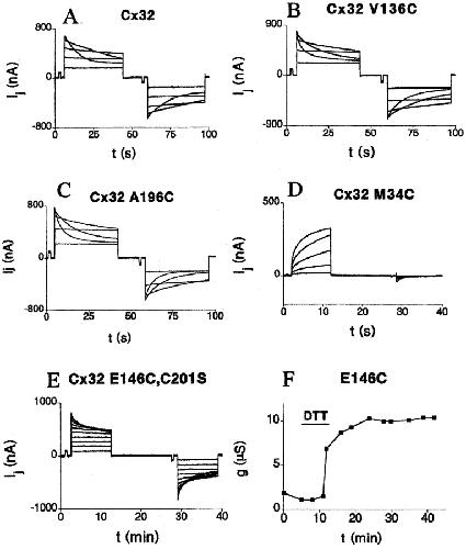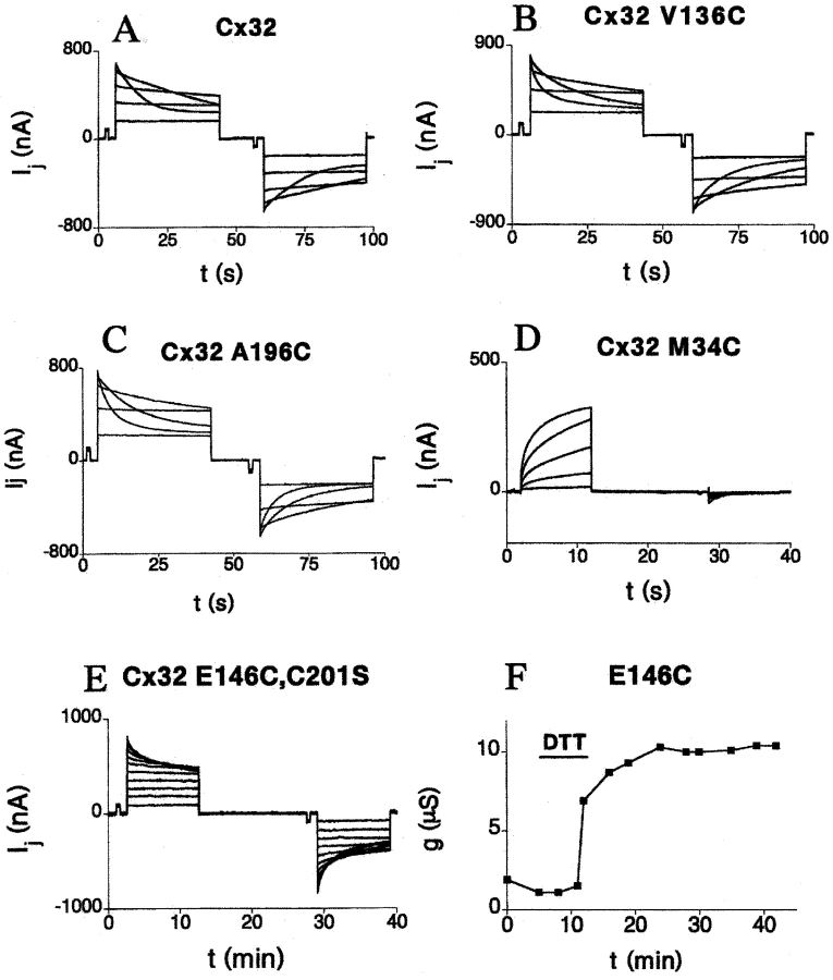Figure 3. Transjunctional currents recorded from paired Xenopus oocytes expressing wtCx32 and several representative cysteine substitution mutants. Oocytes expressing mutants V136C (B), A196C (C), and E146CC201S (E) were paired homotypically (mutant/mutant), and showed gating responses minimally modified from wild-type Cx32 (A). Note that the E146C mutant alone was nonfunctional, and currents could only be recorded for the double mutant or after DTT perfusion of the single mutant (F). (D) M34C was paired heterotypically with wtCx32, with positive polarity defined relative to the mutant-expressing oocyte. These channels, which are closed at rest and open in response to positive transjunctional voltages, are an example of the reverse-gating phenotype discussed in Fig. 2 and the text. In all cases, transjunctional currents were recorded from oocytes clamped at −40 mV, whereas the partner was pulsed in 20-mV increments from the same holding potential.