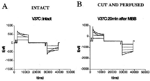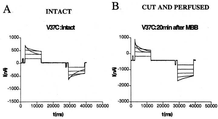 Figure 4. Transjunctional currents recorded from paired Xenopus oocytes expressing Cx32V37C show minimal changes on perfusion. Oocytes were paired homotypically (mutant/ mutant) in the perfusion chamber, and voltage sensitivity of the junctions was assessed in the intact (A) and perfused (B) configuration. Junctional currents were altered only slightly after perfusion. Transjunctional currents were recorded from the intact oocyte clamped at −20 mV, whereas the partner was pulsed in 20-mV increments from the same holding potential.