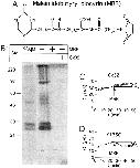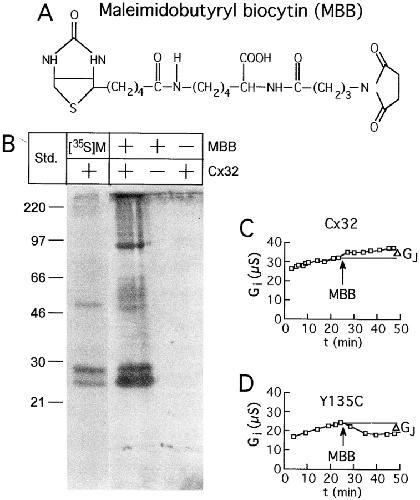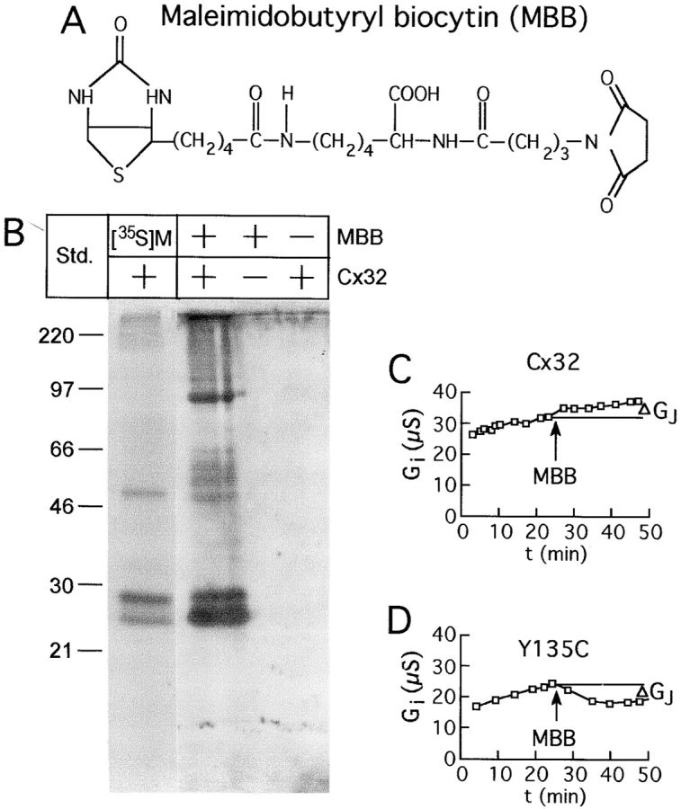 Figure 5. Structure of the thiol reagent maleimidobutyryl biocytin (MBB), and detection of its reactivity with Cx32 in the perfusion chamber. (A) Irreversible reaction occurs between the SH group of a cysteine and the maleimide ring, with the biotin moiety providing easy detection. (B) Biochemical determination that MBB reacts with Cx32 in the dual-oocyte perfusion system. Radiolabeled Cx32, immunoprecipitated from intact oocytes, shows a full-length and partially degraded form just below the 30-kD marker, and an aggregated dimer at ∼50 kD (left lane). Cx32 detected by avidin blot after intracellular perfusion of a paired oocyte with 1 mM MBB and immunoprecipitation of Cx32 (second lane from left) reveals the same bands, although the increased sensitivity of avidin detection revealed additional aggregated forms, both dimeric (50–60 kD) and trimeric (∼90 kD). No protein is detected for noninjected oocytes exposed to MBB or for perfused Cx32-injected oocytes not exposed to MBB (left two lanes). (C and D) Changes in junctional conductance (Gj) during typical SCAM experiments. In most cases, conductance increased steadily before and after addition of the reagent as shown for wtCx32 (C). In cases where a substituted cysteine was accessible, a decrease in conductance occurred after the addition of MBB, as shown for Cx32Y135C (D). The effect of MBB on each oocyte pair was determined by comparison of the conductance immediately before addition of the reagent, to that 20 min after its application (ΔGj).