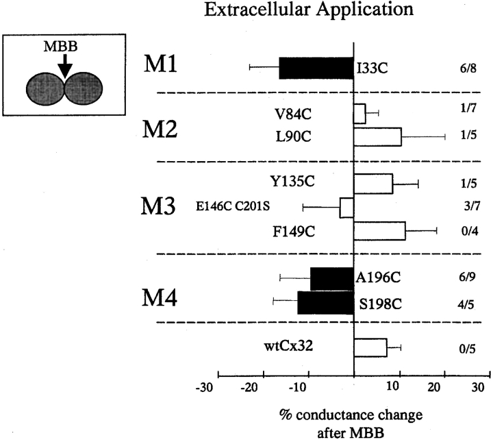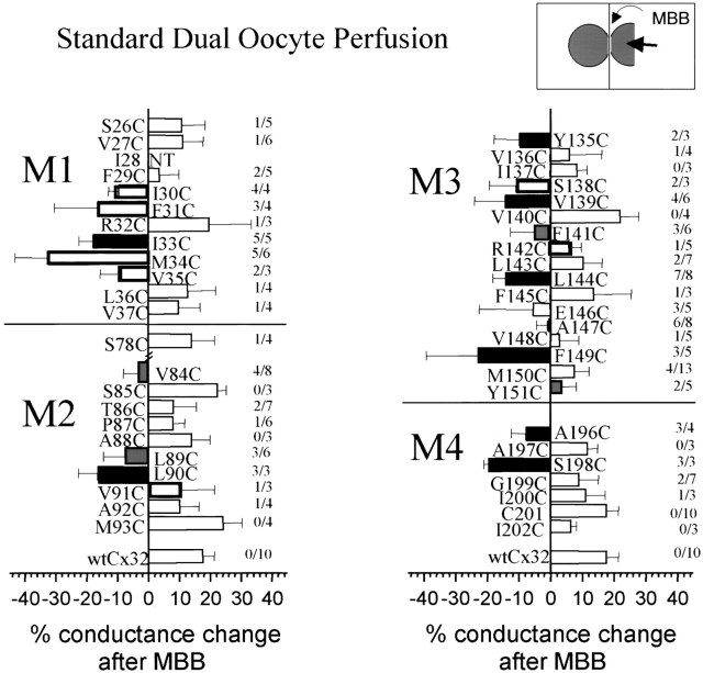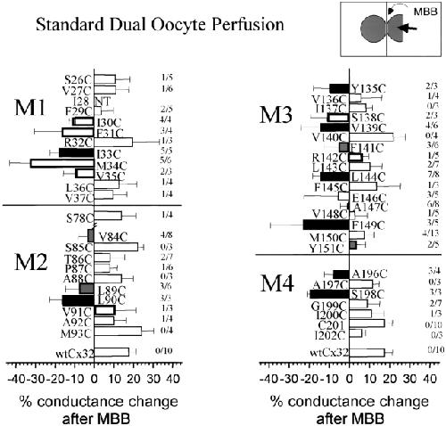 Figure 6. Mean percent changes in conductance after MBB perfusion. For Cx32 and the majority of cysteine substitution mutants, a small increase in conductance occurs after addition of the reagent, which represents a continuation of the trend in conductance before the application of MBB (open bars). A significant decrease in conductance compared to wt was observed after application of MBB to a number of cysteine substitution mutants (black bars, P < 0.01; shaded bars, 0.01 < P < 0.05). In all of these cases, block was also observed in ≥50% of perfusions (>60% for black bars). Bolded open bars indicate sites where cysteine substitution altered the gating properties of the channel. Hence, reactivity does not necessarily infer that the native amino acid lies in an accessible position. Error bars represent SEM. Numbers adjacent to the bars indicate the number of experiments where conductance was reduced versus the number of experiments conducted.